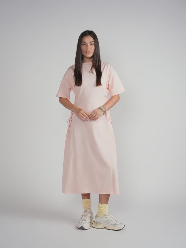 An oversized t-shirt dress with short sleeves, featuring a loop pattern and side ties for a more fitted look. Available in short and midi lengths, perfect for a comfortable casual look with a stylish touch.