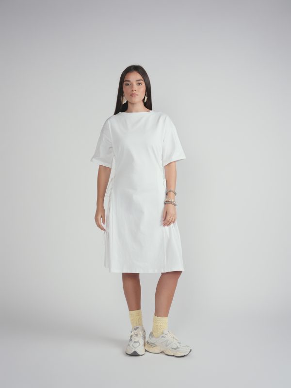 An oversized t-shirt dress with short sleeves, featuring a loop pattern and side ties for a more fitted look. Available in short and midi lengths, perfect for a comfortable casual look with a stylish touch.